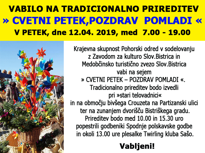 Svet KS Pohorski odred je dne 22.3.2013 med 07.00 uro in 19.00 uri v sodelovanju z občino Sl. Bistrica in gospodarsko družbo Komunala d.o.o. Slov Bistrica organiziral že tradicionalno prireditev »CVETNI PETEK«, katera je potekala na že dveh ustaljenih lokacijah.
