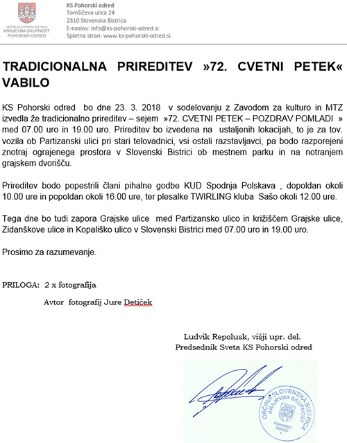 Za uspešno izpeljano prireditev se želimo javno zahvaliti sodelujočim pri sami izvedbi, to je občini Slov. Bistrica, Komunali d.o.o. Slov. Bistrica, Medobčinskemu inšpektoratu in redarstvu občin Sl. Bistrica, Poljčane in Makole, policistom Policijske Postaje Sl. Bistrica in Tedniku Panorama za medijsko obveščanje.